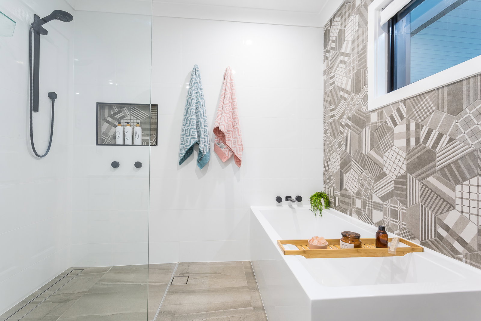 – The master bathroom is freshly renovated and features beautiful tiling, full sized bath, frameless shower and modern fixtures & fittings.