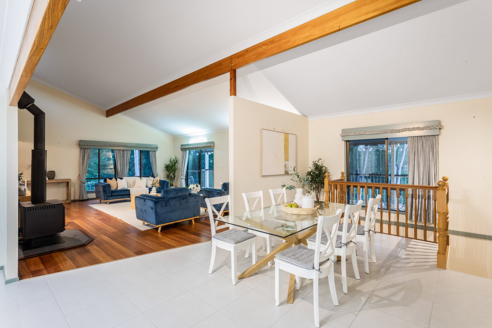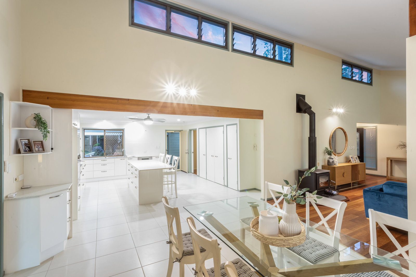 Inside, the home opens into a stunning split-level design, where soaring vaulted ceilings and natural light create a warm and inviting atmosphere. The main living area is spacious yet comfortable, centred around a wood fire burner and flowing effortlessly into the kitchen and dining areas.