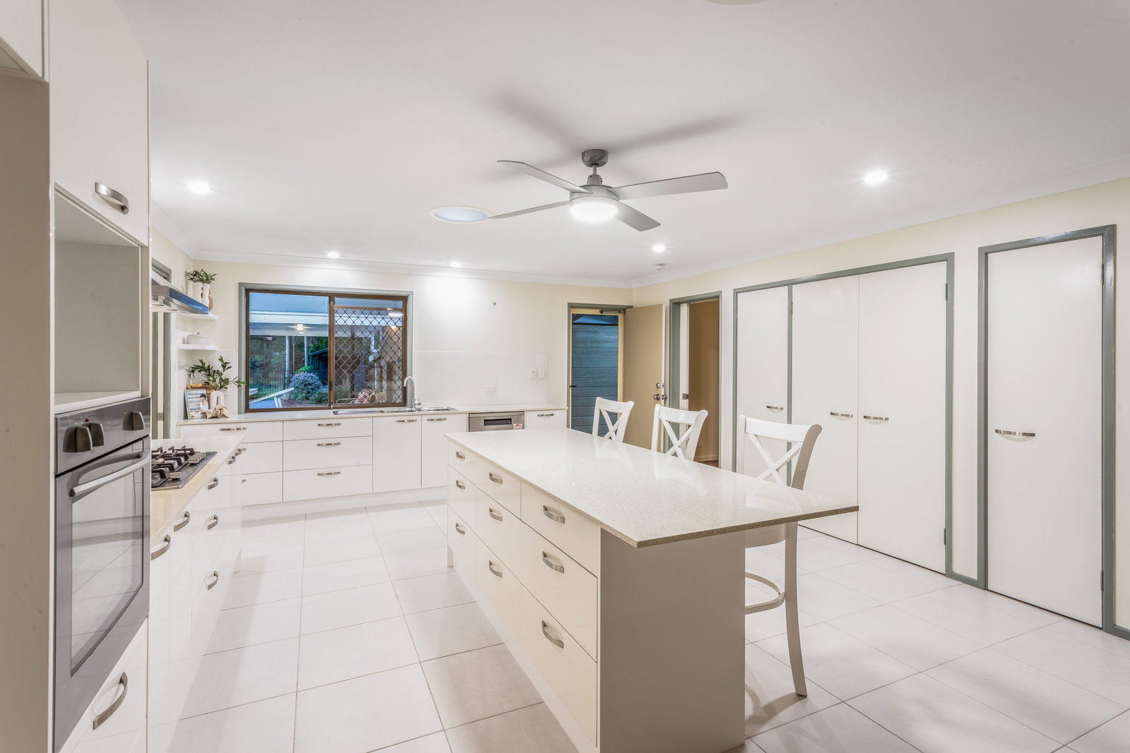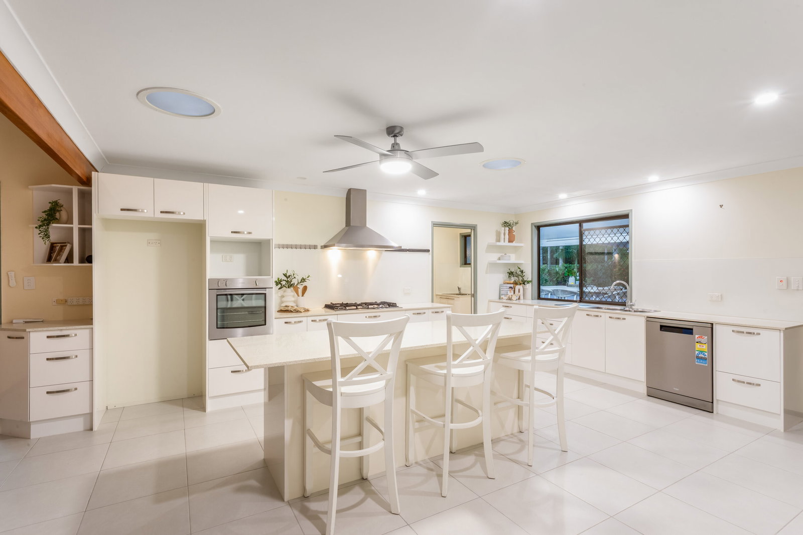 The kitchen itself is generous and beautifully appointed, featuring stone benchtops, a large gas cooktop, stainless steel appliances, and excellent storage. Designed for both everyday living and entertaining, it connects seamlessly to the expansive outdoor entertaining area.