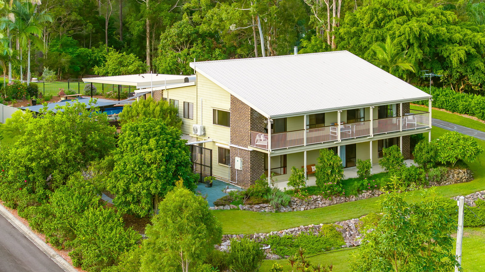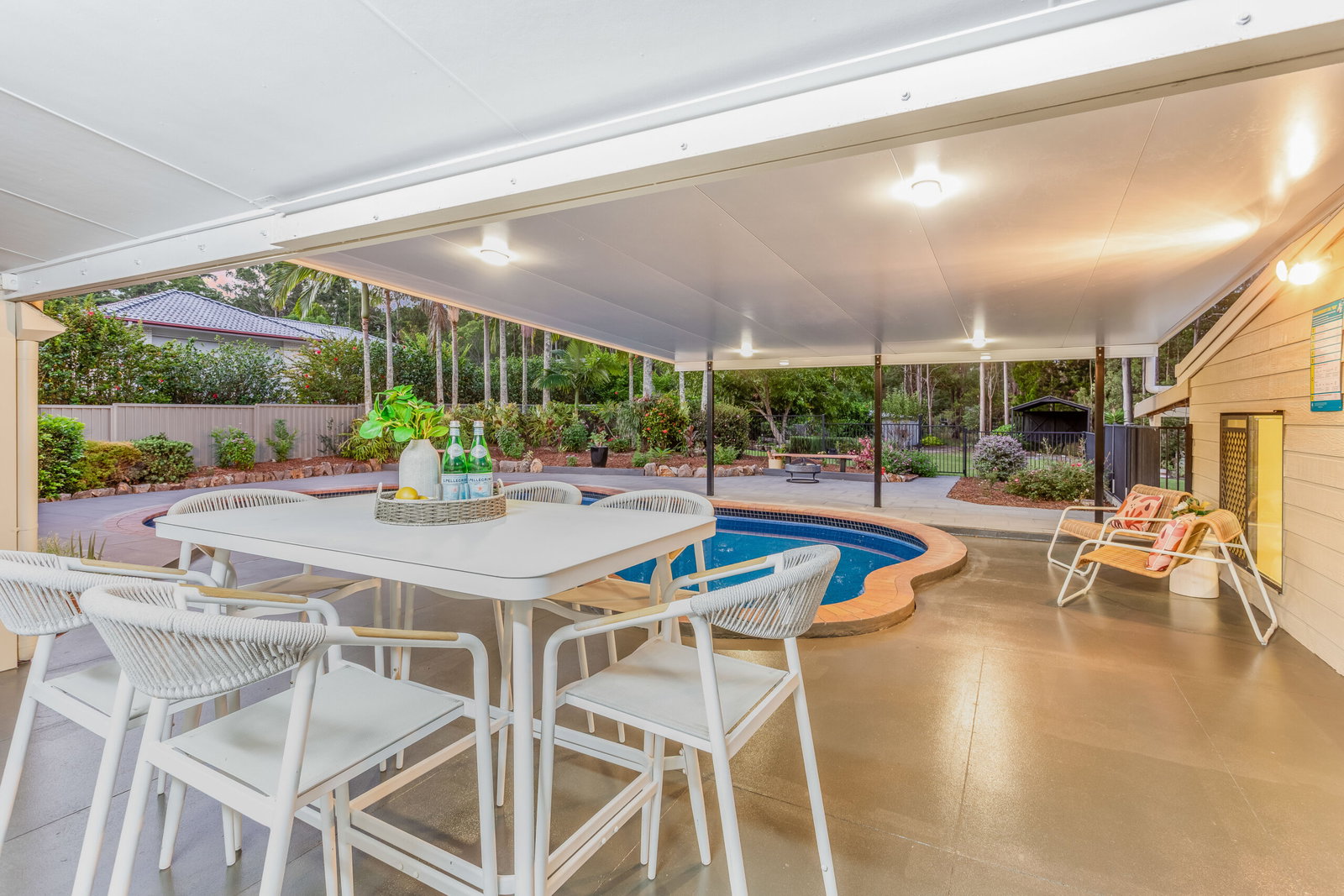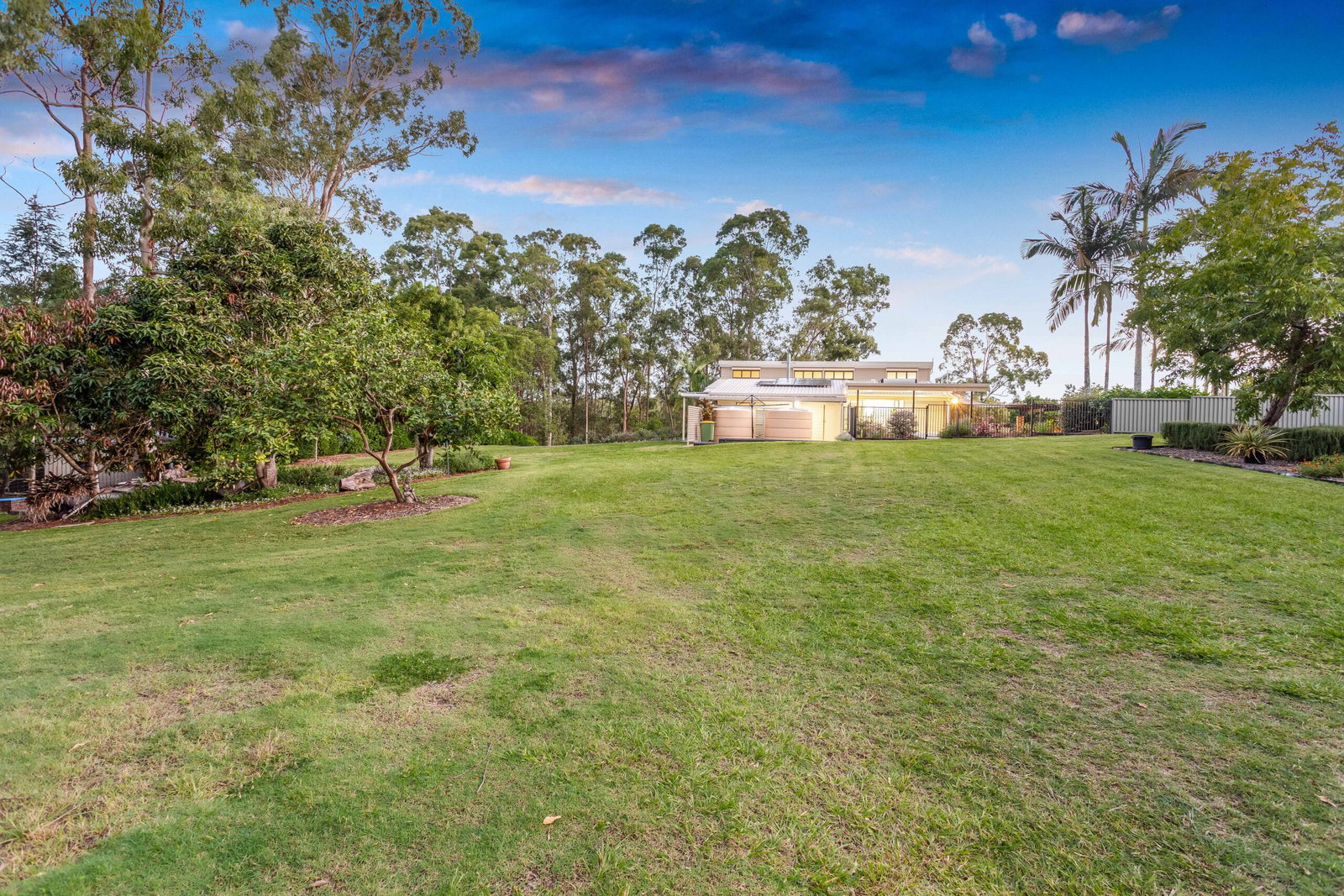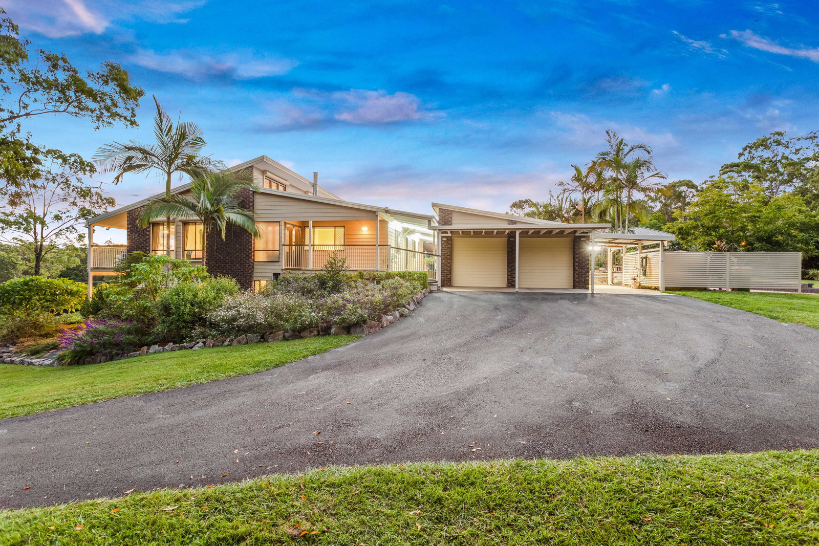 Arriving via the sealed driveway, you’re welcomed by immaculate grounds that immediately set the tone. The gardens are beautifully maintained, blending established native plantings with a selection of fruit trees including mango and macadamia – creating a space that feels both natural and thoughtfully curated.